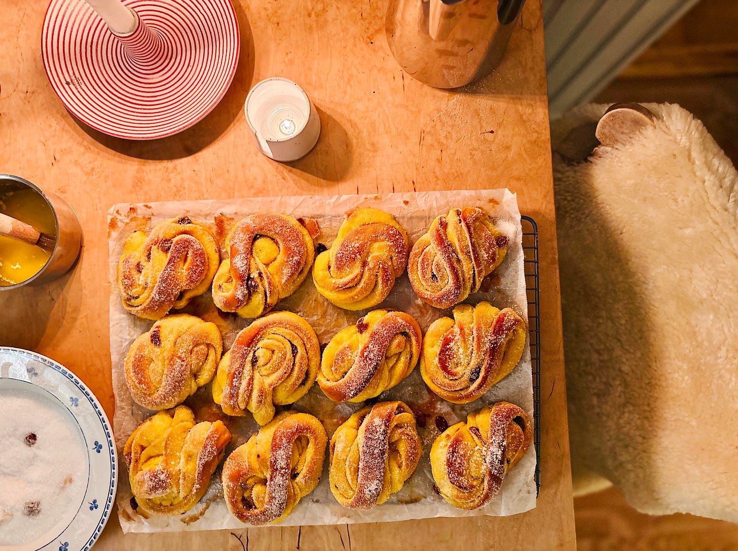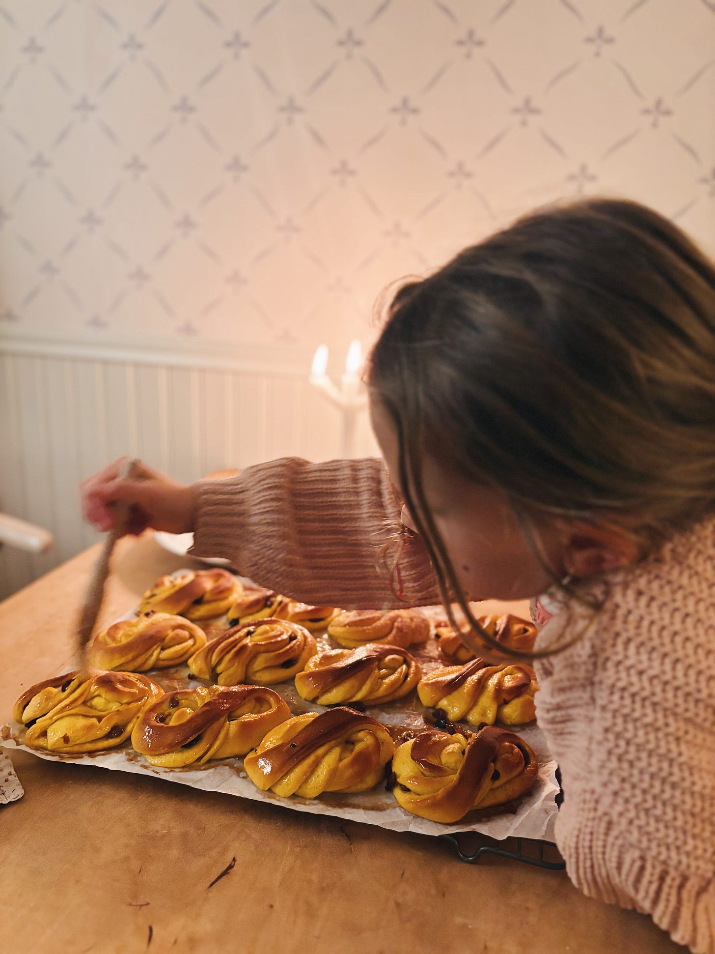 Butter softening on the counter. Raisins plumping in a pan of boiling water. Sienna rolling the dough onto our wooden bakbord, folding it into thirds. I cut it into strips and showed her how to shape them into my absolute favourite, reminiscent of traditional lussekatter.
